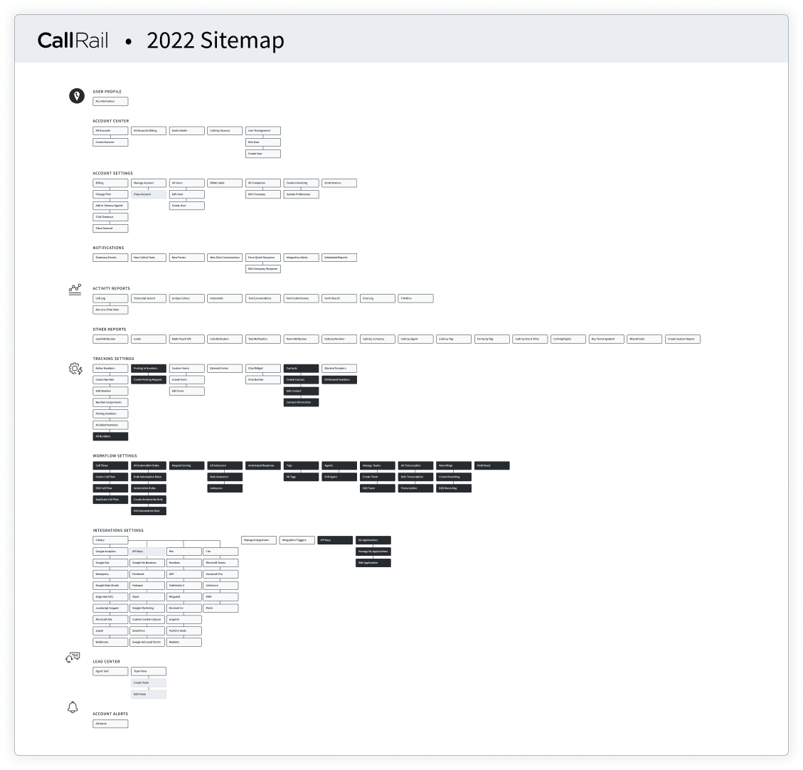 After 10 years and 3 additional products, CallRail’s webapp architecture was confusing, and it was getting in the way of user onboarding. Settings and configuration pages are now centralized under a single section, which is accessed through the product’s global navigation.