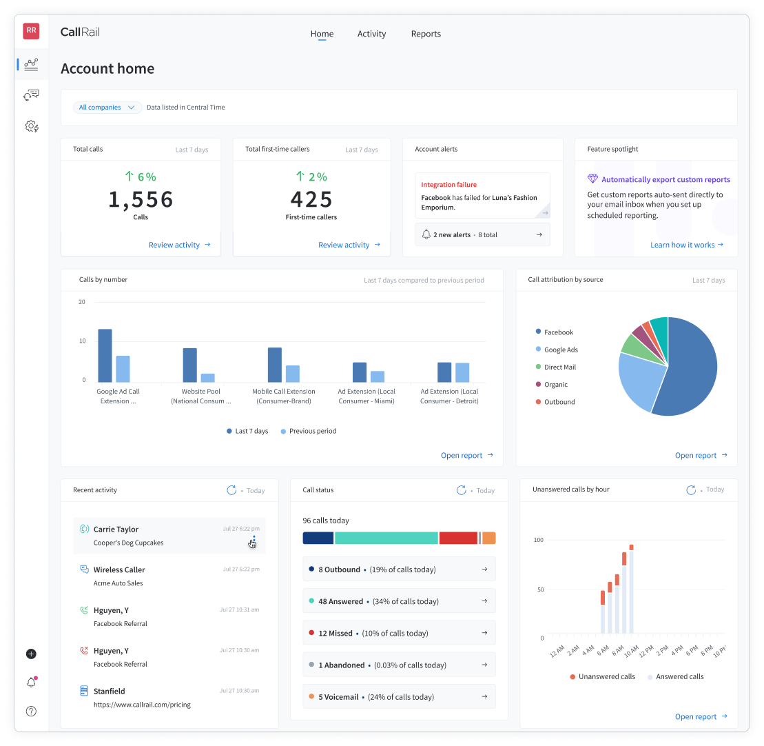 When users log into CallRail, they now find aggregated insights and date comparisons to more quickly understand how marketing efforts perform week over week. The previous app landing page, a call log, is accessed through a link on the total calls card, which reduces the number of large backend queries and improves app performance.